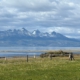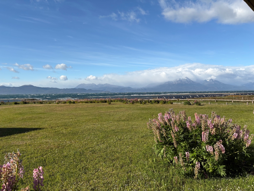 Ich schaue über die Bucht und sehe im Hintergrund teilweise schneebedeckte Berge, die zu Chile gehören.