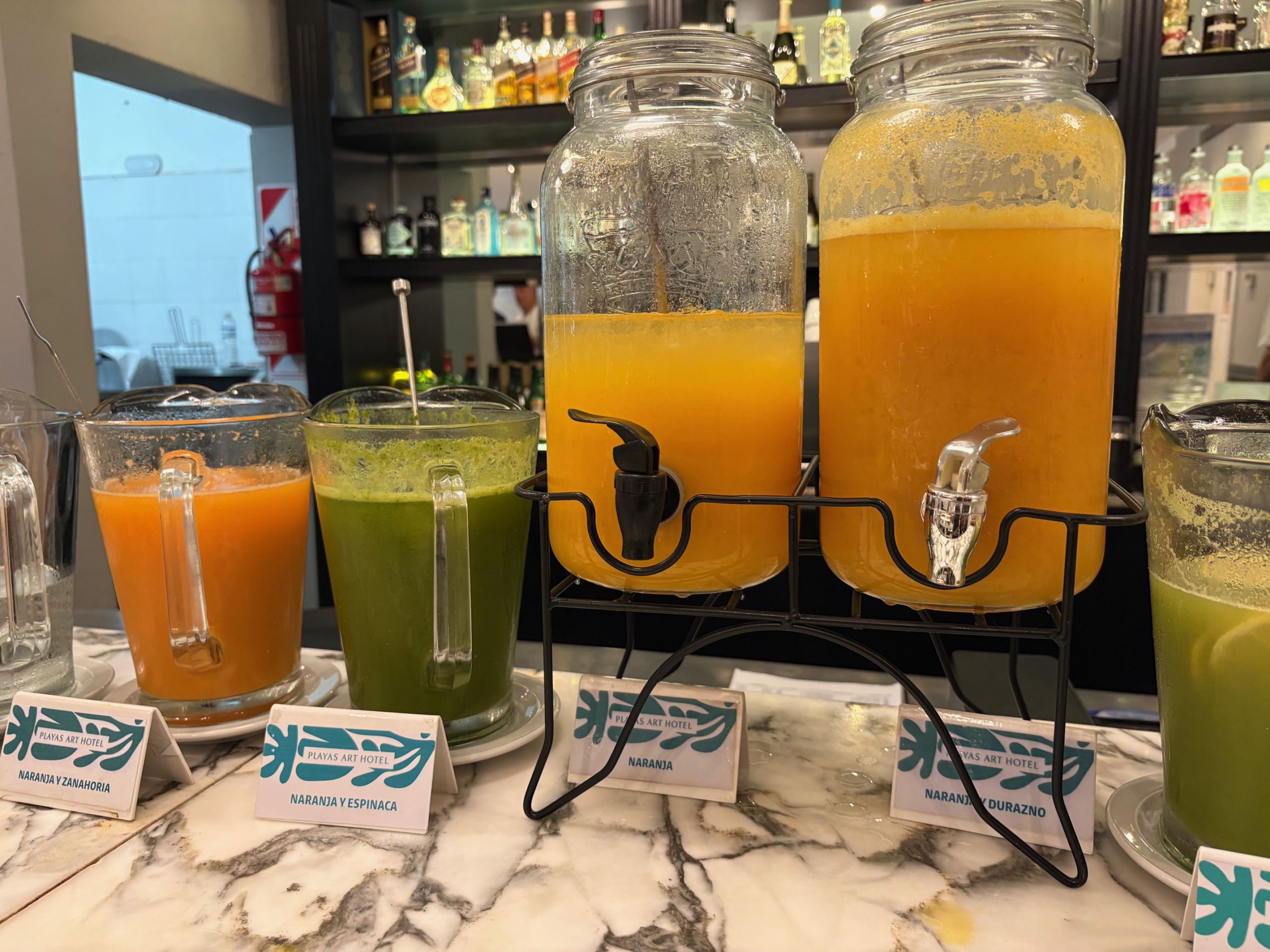Wir sitzen beim Frühstück und genießen die leckeren frisch gepressten Säfte.